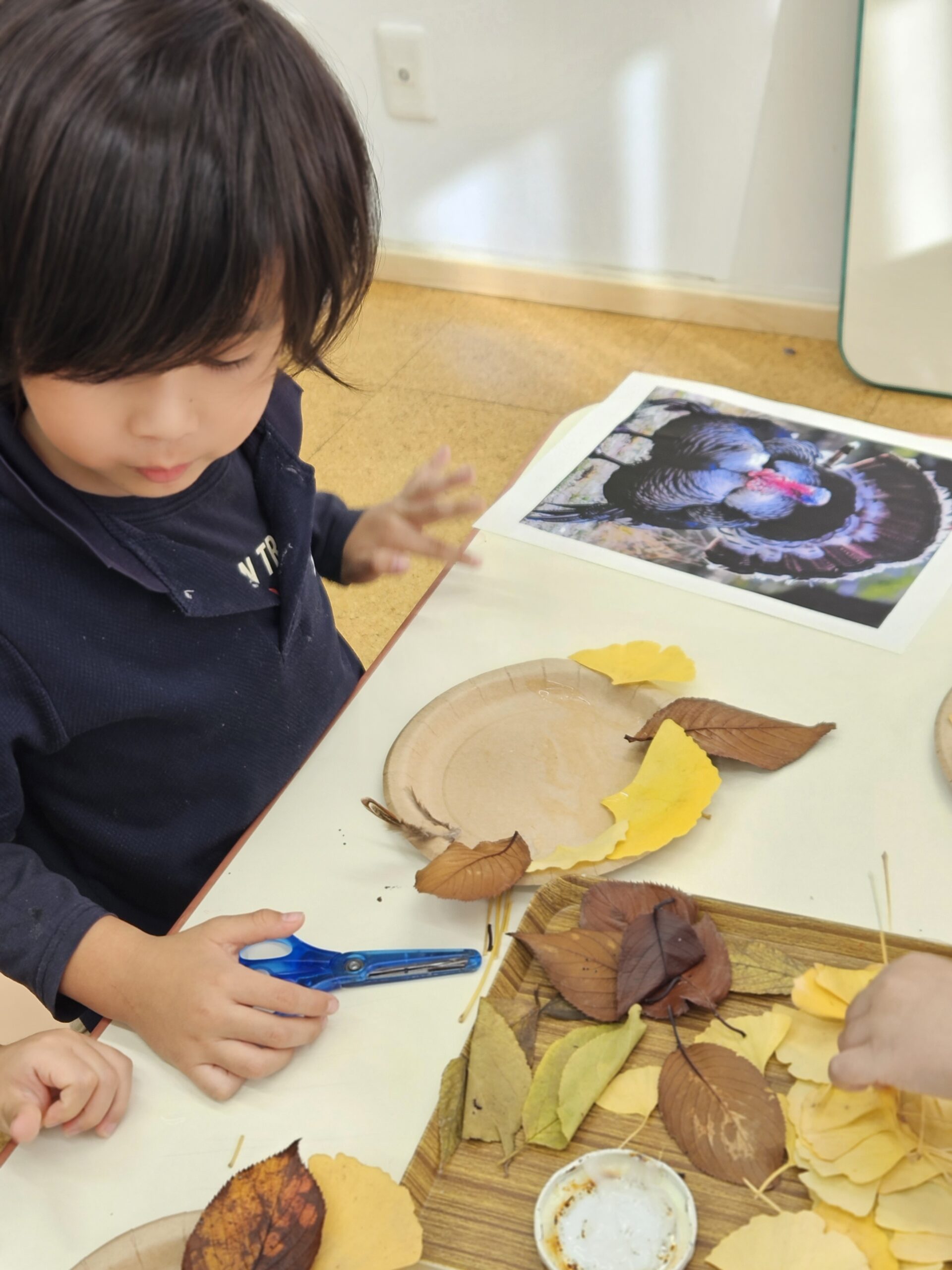 サンクスギビングのお祝いとして、子どもたちは銀杏やケヤキの葉っぱを使って “ターキー(七面鳥)” を表現しました。