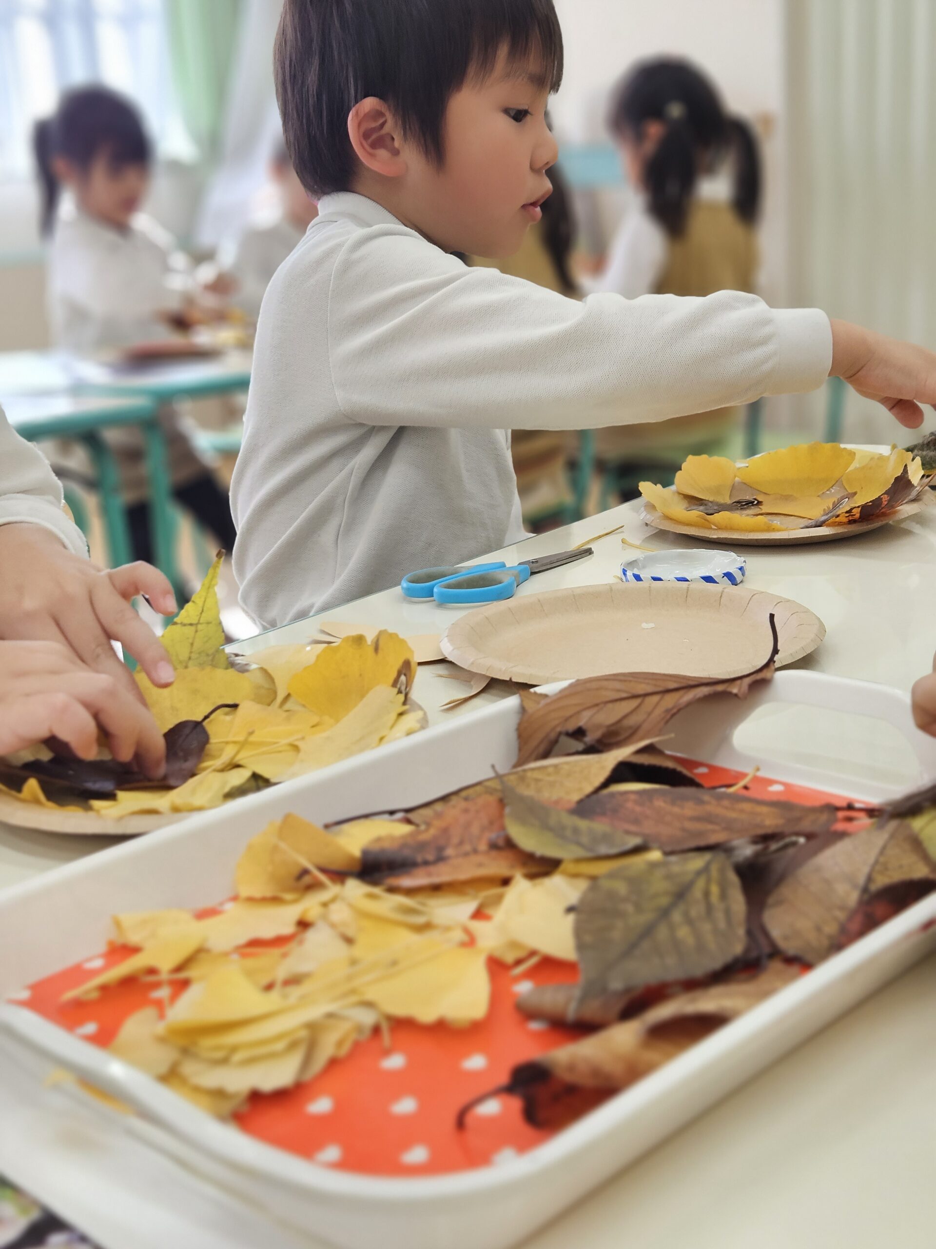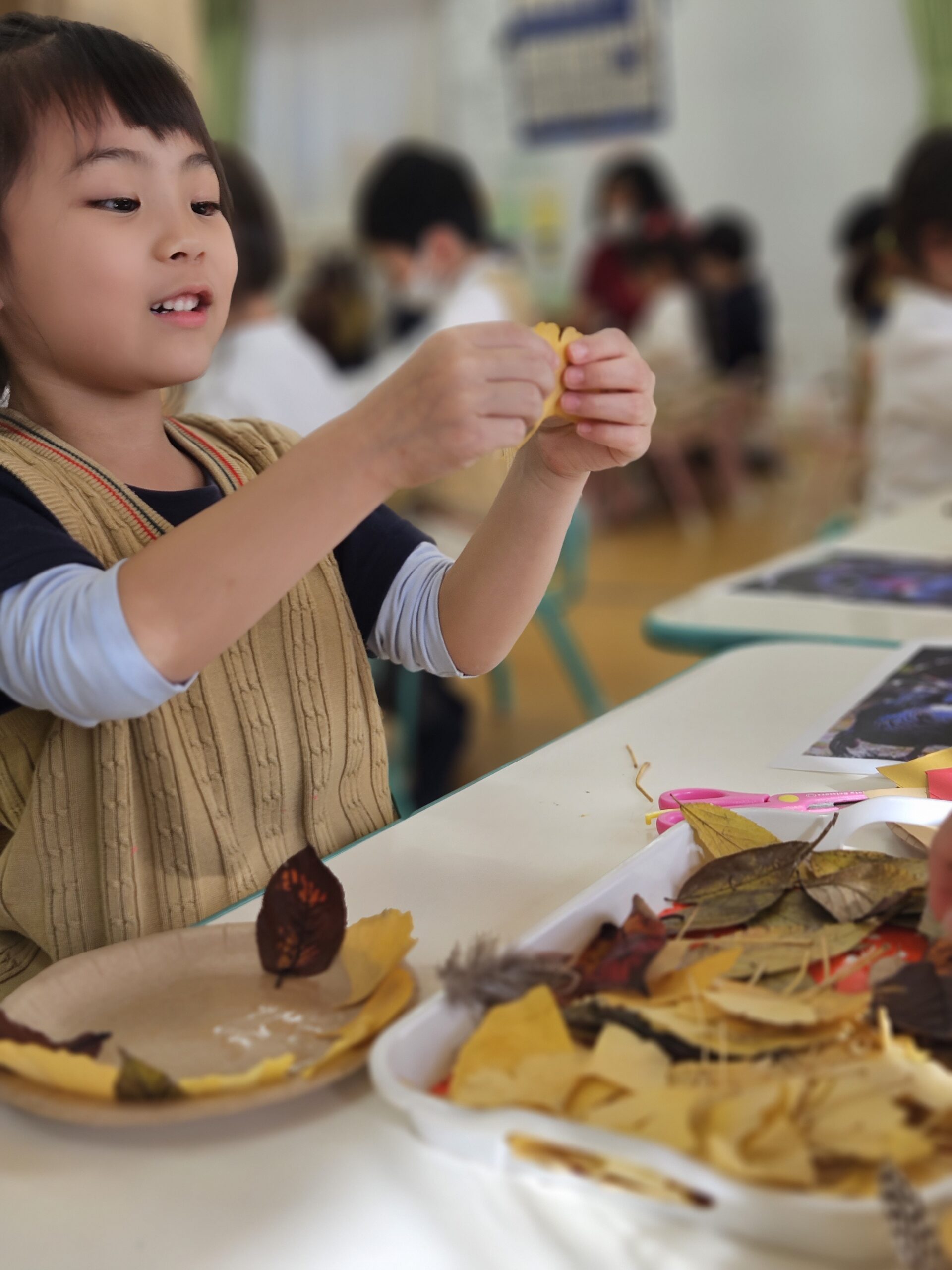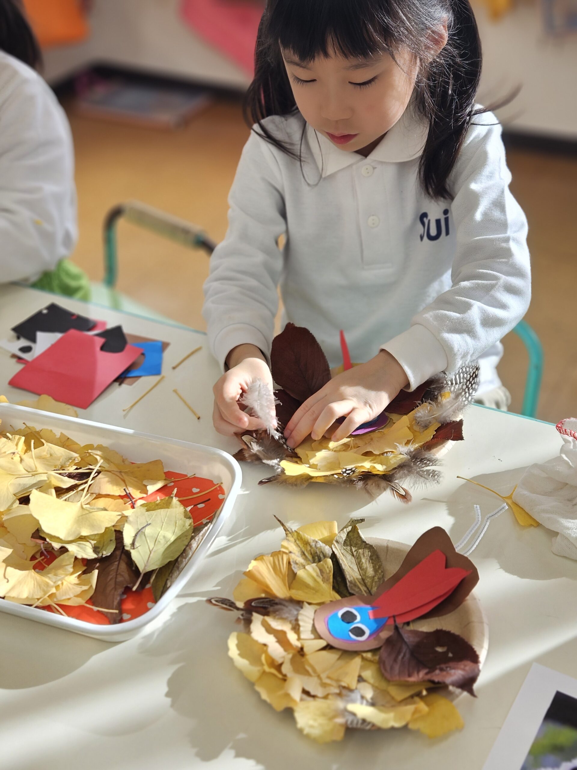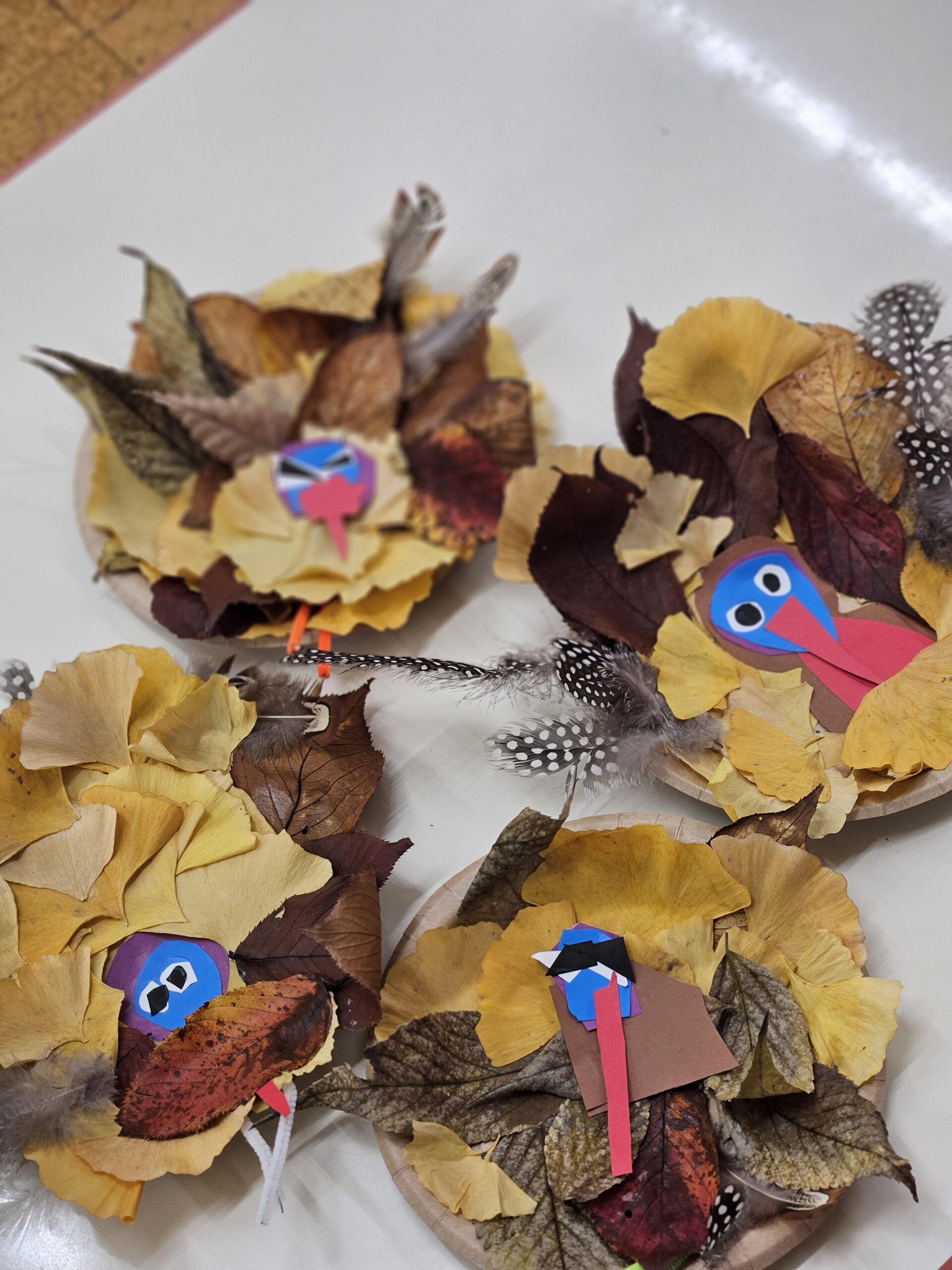 葉っぱの色や形、質感を自由に組み合わせ、一人ひとりの個性が光る、ユニークで創造的なターキーが完成しました。秋ならではの自然素材に触れながら、表現する楽しさや季節の美しさを味わうことができた、豊かなアート活動となりました。